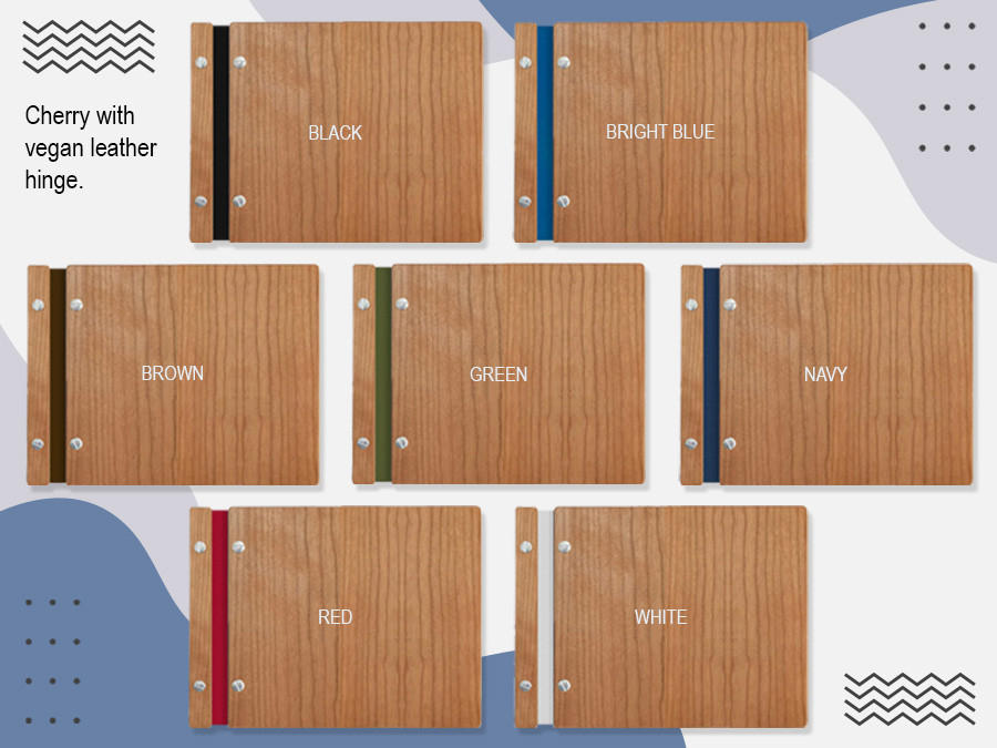 An important note about colors. The engraving on the veneer is a dark brown which varies slightly piece to piece. Leather colors are not guaranteed as accurate due to monitor settings, processing and other variants. The actual color names are black, dark brown, red, sage, cobalt, navy and white.