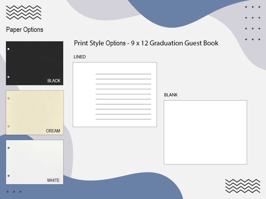 The paper content options include standard white bond with black print, white card stock with black print, and cream and black card stock which have no printing. Paper size is 8.5 x 11 inches.